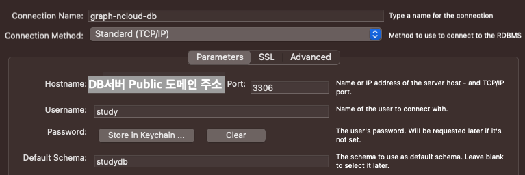 spring.datasource.hikari.jdbc-url=jdbc:mysql://[DB 서버 Public 도메인 값]:3306/studydb?serverTimezone=Asia/Seoul
