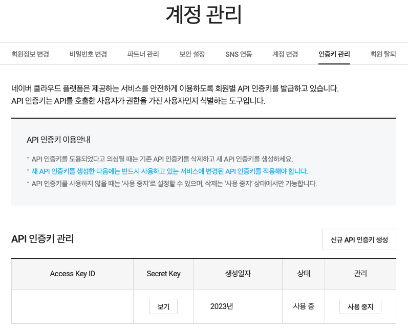여기서 인증키 값들을 살펴보겠습니다. 네이버 클라우드 플랫폼 홈페이지에서 마이페이지 > 계정 관리 > 인증키 관리로 들어갑니다. API 인증키 관리 탭에 Access Key ID, Secret Key를 저장해서 넣어주면 됩니다.