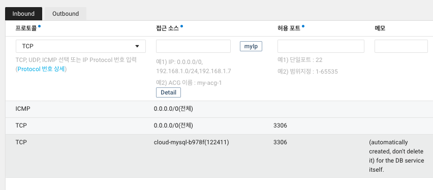 ACG 설정을 누르면 규칙을 변경할 수 있습니다. TCP 접근 소스를 0.0.0.0/0, 허용 포트를 3306 으로 추가 설정해주고, ICMP도 0.0.0.0/0으로 설정후 적용합니다.