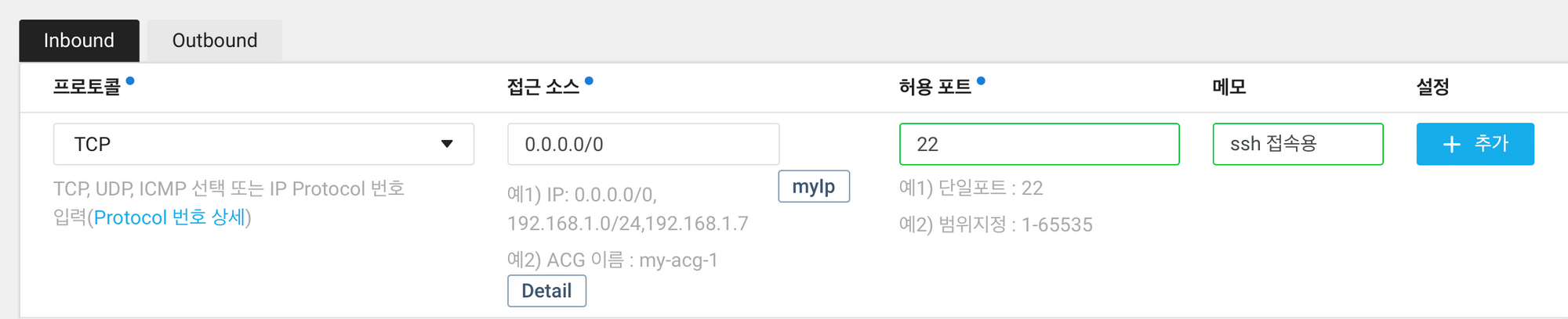 ssh 접속을 위해서는 ACG 설정에서 TCP 허용 포트를 22로 Inbound 규칙에 추가해줍니다. 다시 ACG 우측 버튼을 눌러주면, ACG 설정으로 이동합니다. 여기서 df로 시작하는 규칙을 선택하고 ACG 설정을 누른 후, Inbound 규칙에 TCP / 본인 IP / 허용포트는 22로 설정해서 추가 버튼을 누르고 적용까지 눌러줘야 저장이 됩니다.