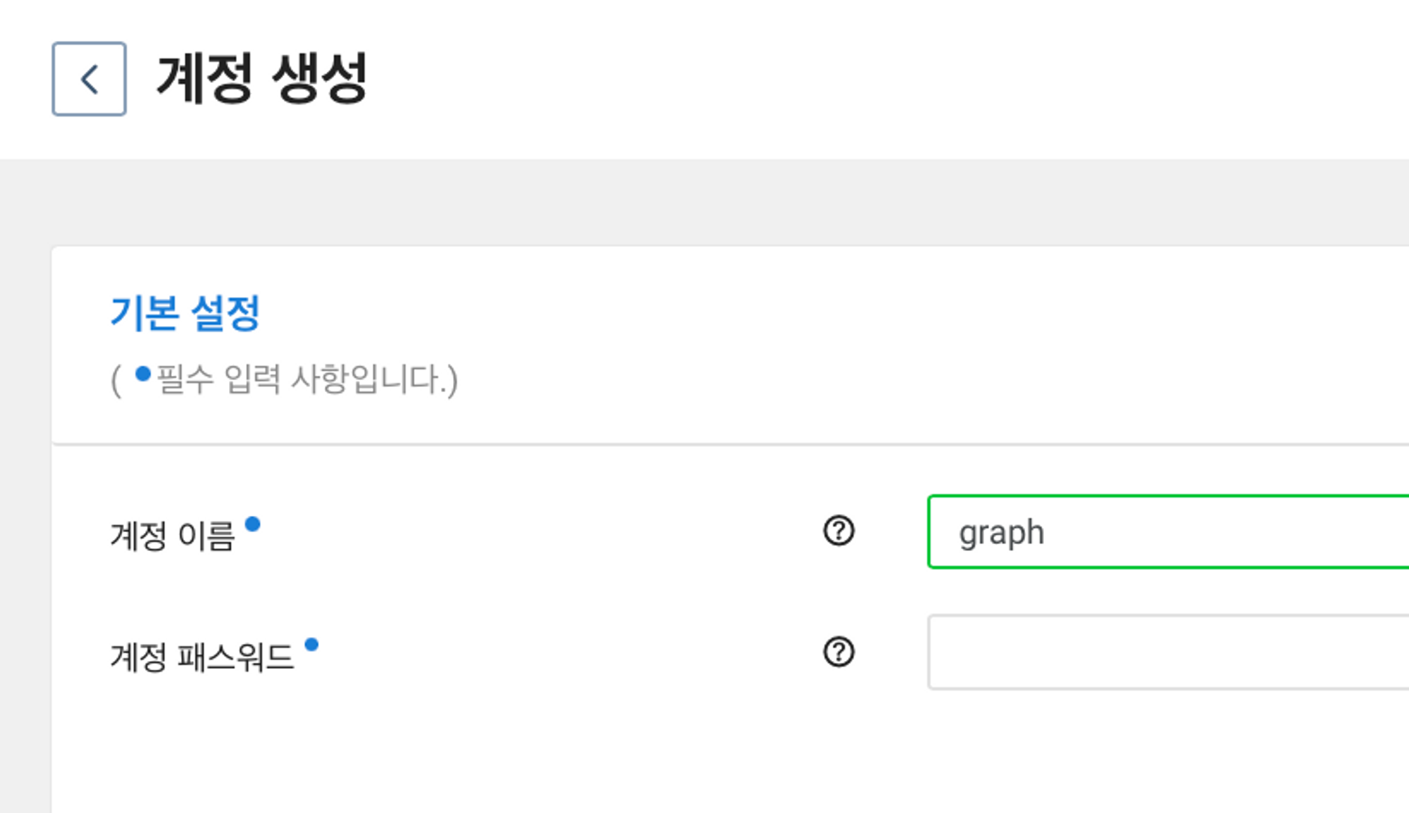 계정 이름은 최소 2자 , 최대 16자의 영문자, 숫자를 조합하여 사용할 수 있습니다. 비밀번호는 8자 이상, 20자 이하의 영어대소문자/특수문자/숫자 각각 1자 이상 포함해야 하고 특수문자도 조건이 있으니 잘 피해서 설정하겠습니다.
