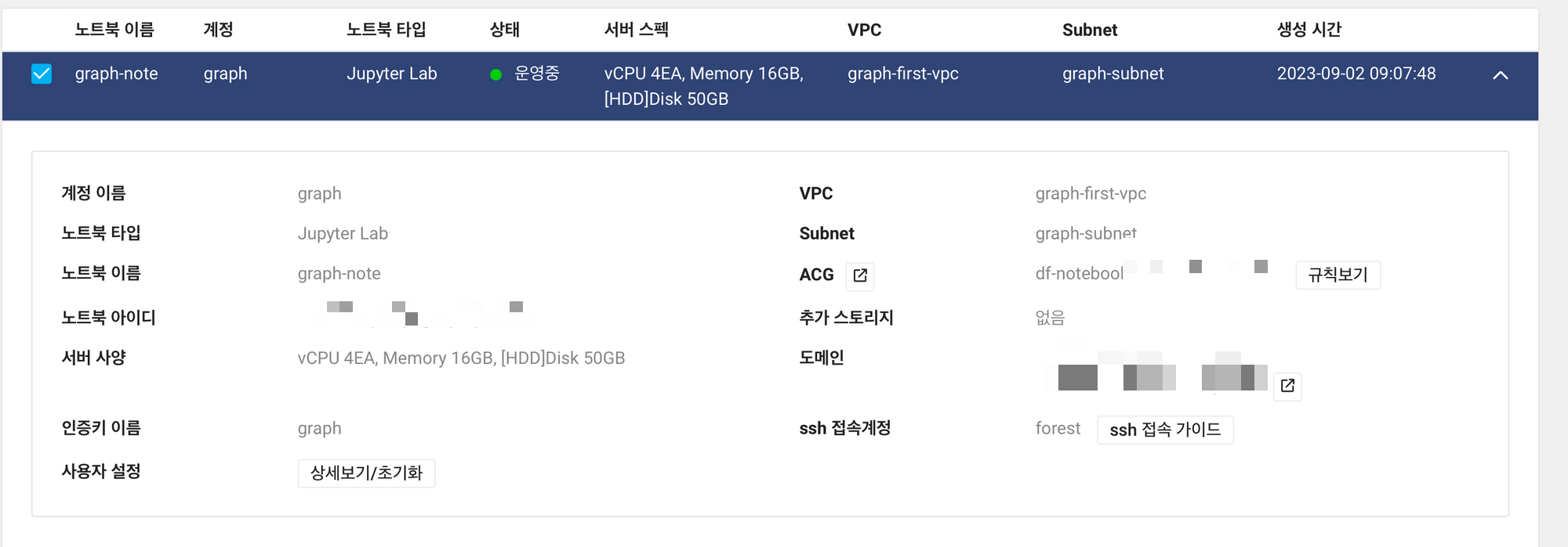 운영중으로 변하면, 간단히 상세 노트북 정보를 확인할 수 있습니다. Subnet, ACG 정보 등이 있고 노트북 아이디, 도메인, ACG 이름 정도만 알아 둡시다.