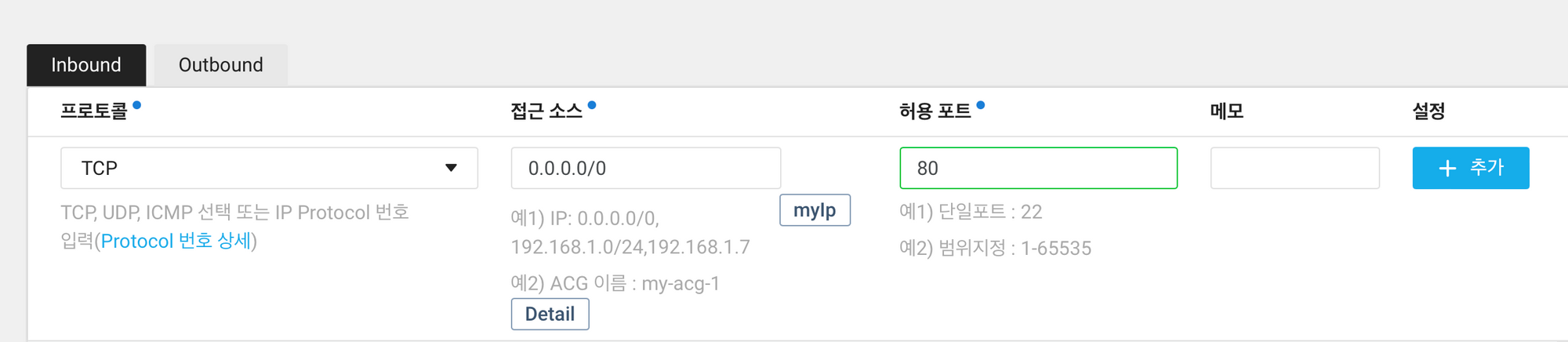 위에서 자동 생성한 ACG 이름이 df(data forest)로 시작하는 것을 찾아서 Inbound 허용 포트를 추가해줍니다. 접근 소스는 보안을 위해서는 myIP를 눌러서 본인 IP에서만 접속을 허용해주는게 좋습니다. 저는 연습을 위해 0.0.0.0/0(전체)로도 하겠습니다만, 보안상 권장하지는 않습니다.