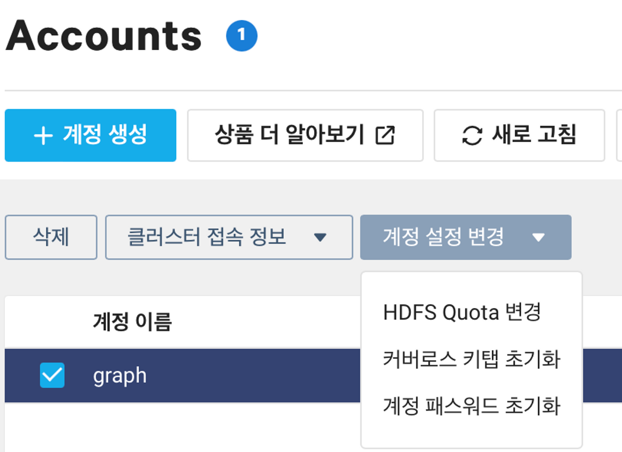 그 외에도 계정 설정 변경은 HDFS Quota(파일 개수: 1 백만 개, 용량: 200TB)를 바꾸거나 커버로스 키탭 / 계정 패스워드를 초기화하는 옵션을 제공합니다.