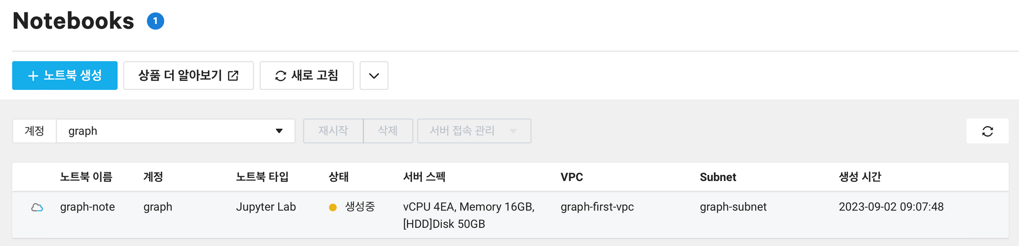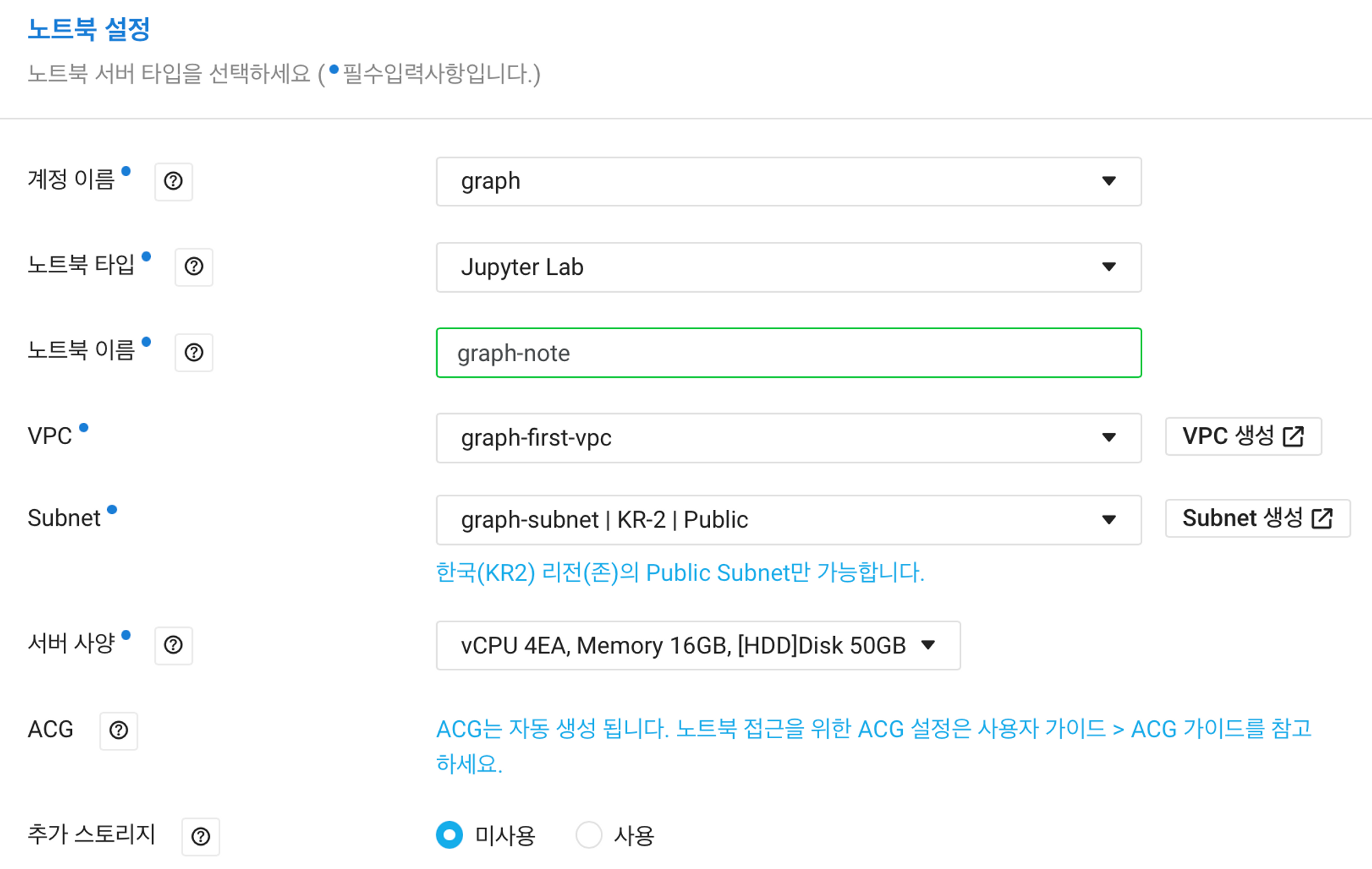 노트북 설정은 아래와 같습니다. 노트북 이름은 설정할 때, 영어 소문자, 숫자, 하이픈으로만 구성해야하고 첫글자는 영어로 하고 마지막 글자가 하이픈이 아니면 됩니다. 또한, Subnet은 KR2 리전의 Public Subnet만 설정 가능하다는 점도 알아둡시다. 서버 사양은 가장 낮은 것으로 해두었습니다. 4EA vCPU, 16GB 메모리, HDD 50GB로 설정했습니다.