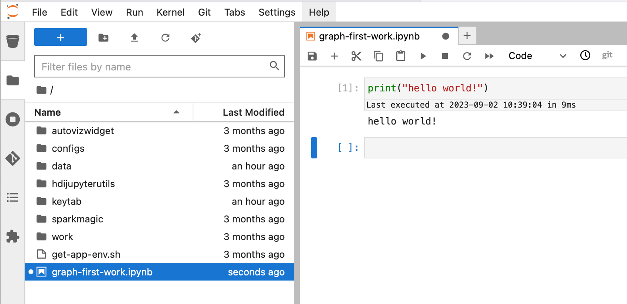 간단하게 ipynb 파일을 생성해서 hello world!를 출력해봤습니다.