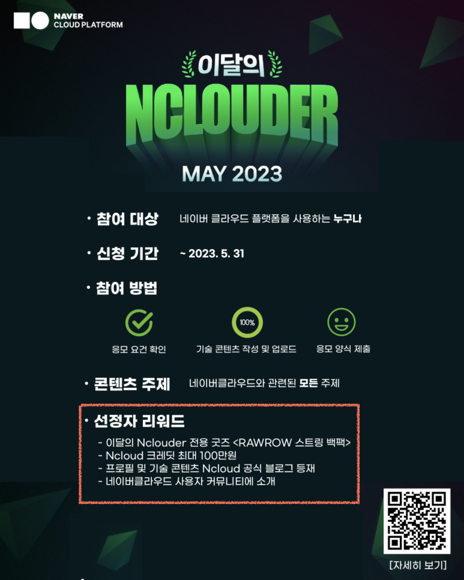네이버클라우드의 기술 콘텐츠 리워드 프로그램 이달의 Nclouder 5월 모집이 완료되었습니다! (Hoxy...아...