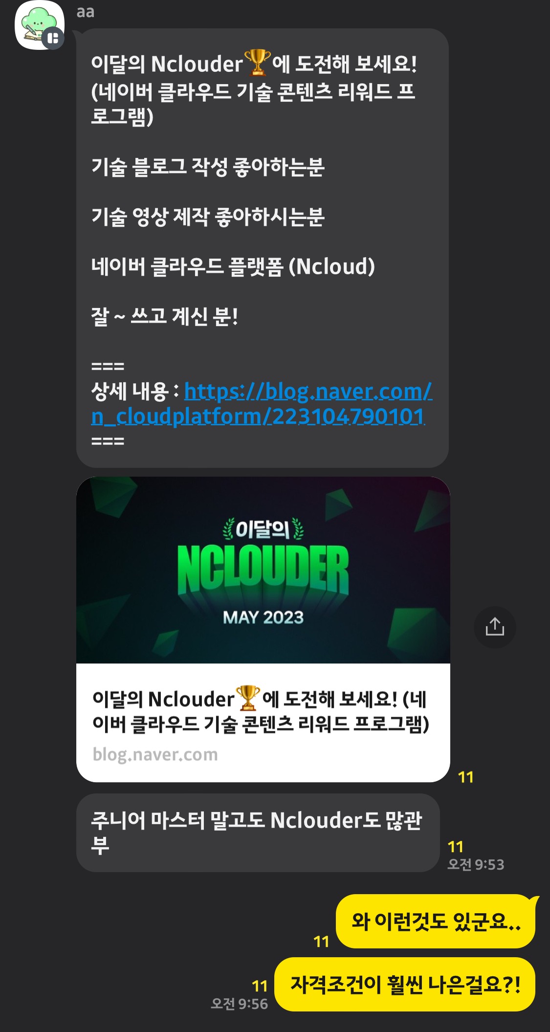 그 와중에 웹개발 교육 과정에서 네이버 클라우드를 사용해보는 기회를 얻었습니다. 그리고 NCUC(네이버 클라우드 유저 커뮤니티) 오픈채팅방에서, 네이버 클라우드에서 기술 콘텐츠 리워드 프로그램인 "이달의 NCLOUDER"를 모집한다는 글과 포스터를 보게됩니다.