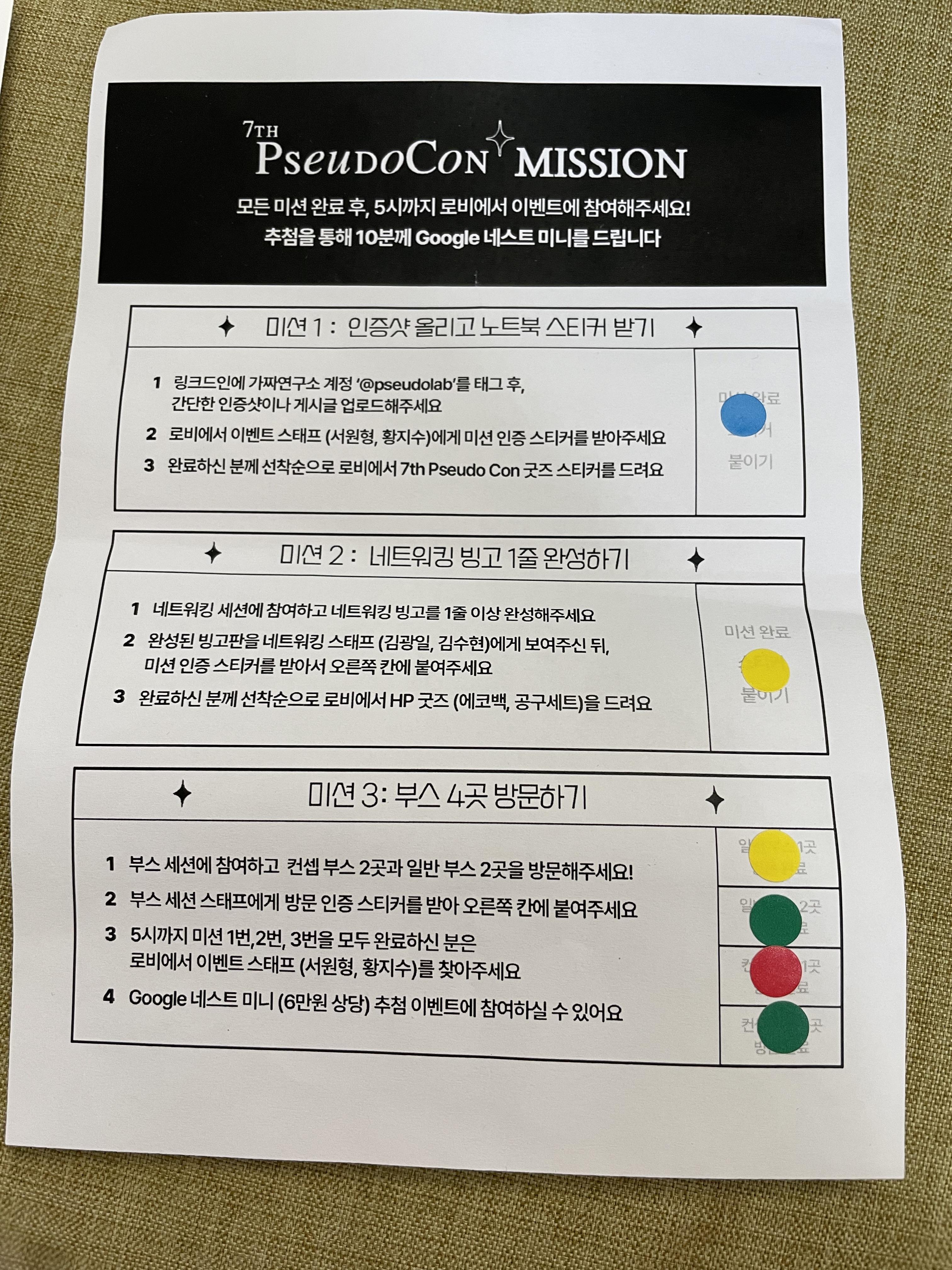 겨우 찾아낸 2층 출입구 앞의 간판입니다. 다행히 2층에 와서는, 입구 앞에서 Staff 및 운영진 분들이 안내해주셔서 잘 찾아왔습니다. 제 이름을 말씀드리고, 멋진 팻말을 목에 착용하고 들어와서 미션 종이를 받았습니다. 우측에 작게 보이는 저 구글 네스트 미니가 경품입니다. 아주 마음에 듭니다. 구글의 AI 스피커는 못참죠!