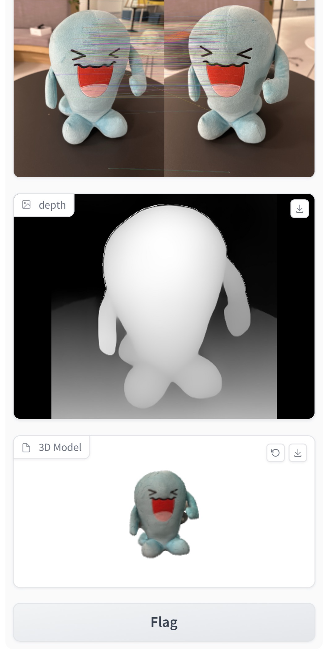 참고로 저는 마자용 인형 사진을 활용해서 gradio 앱에 적용하여 3D reconstruction을 진행했습니다. 귀여운 마자용이 몇개의 사진만으로 3D 모델링이 되어, 자유롭게 3D 회전을 해보며 뒷모습, 옆모습 등이 자연스럽게 나타나는 점이 신기했습니다.