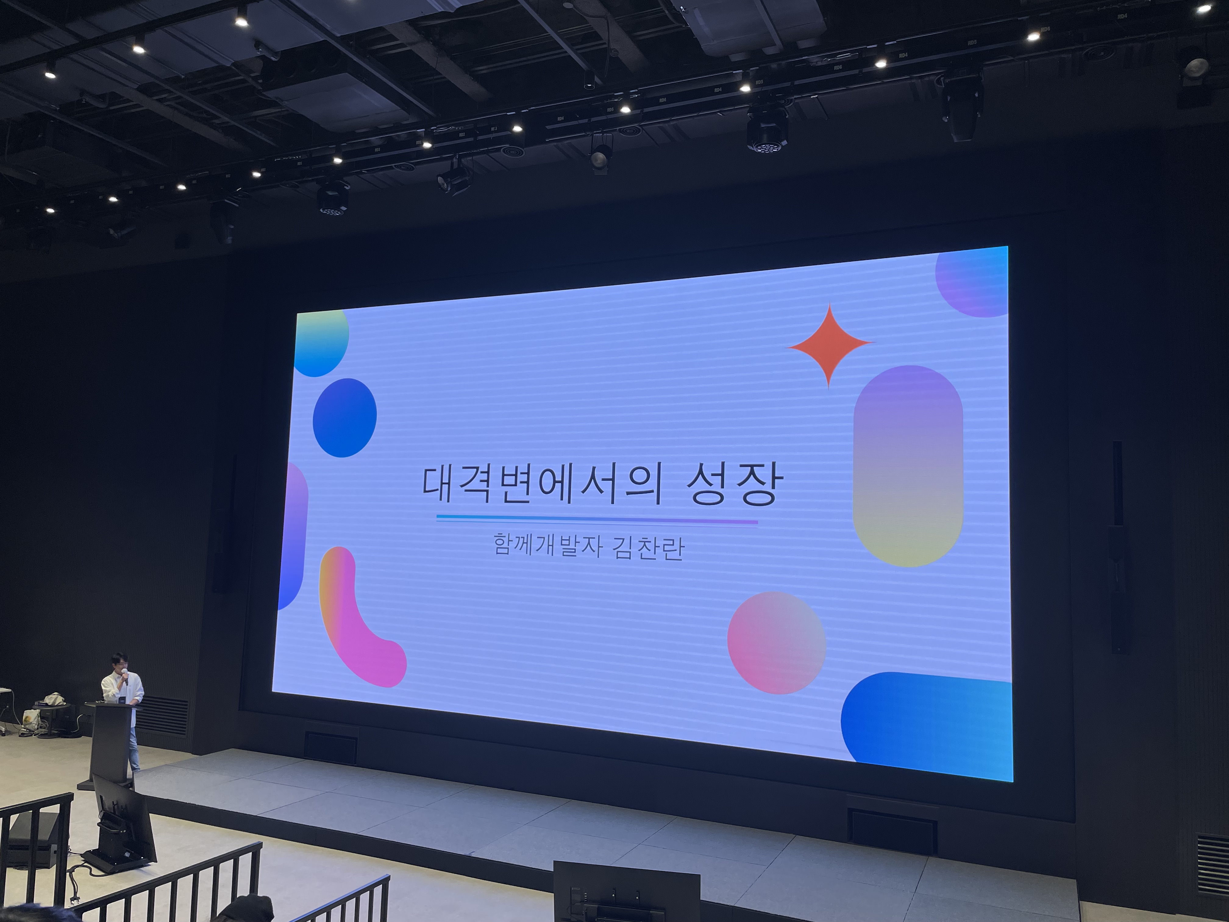 메인 홀에서 진행하는 세션을 먼저 들었습니다. 찬란님의 대격변에서의 성장 이야기를 들어보고 가짜연구소의 역사와 발전 사항, 그 속에서 일어난 다양한 성장 스토리를 경험할 수 있었습니다. 관심있던 것은 역시 "생존"입니다. 최근 OpenAI의 발표로 인해 많은 미국의 스타트업이 위기를 겪는다고 하죠. 그만큼 압도적인 AI 하나가 이제는 다양한 산업군에 영향을 미치는 시대가 빠르게 찾아왔고, 앞으로 어떻게 변할지 모르는 불확실한 상황입니다.