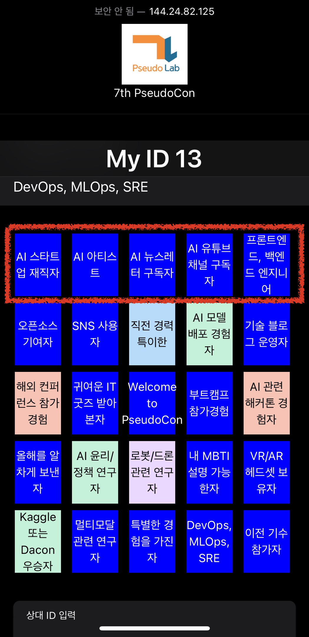 아이스 브레이킹 세션이 없는 대신, 네트워킹 빙고 게임이 있습니다. 가짜연구소는 온라인 커뮤니티에서 시작하다보니, 오프라인 미팅에서는 서로를 좀 더 알아가는 시간이 필요합니다. 그래서 멋진 빙고 게임을 준비했는데요, 각자 이름과 키워드를 선택합니다. 그리고 아래 앱을 통해 서로 인사하고 상대방의 ID를 전송하면 서로 선택한 키워드를 바탕으로 빙고 칸에 파랗게 색이 칠해집니다. 저는 이전 가짜연 참가자, 기술 블로그 운영자, DevOps 등으로 선택했고, 정말 다양한 분들을 많이 만날 수 있었습니다. AI 스타트업 재직자부터 올해를 알차게 보낸 자들과 함께했습니다! 아래 빙고 한 줄을 재빠르게 채우고 당당히 스티커를 받았습니다. (에헴)