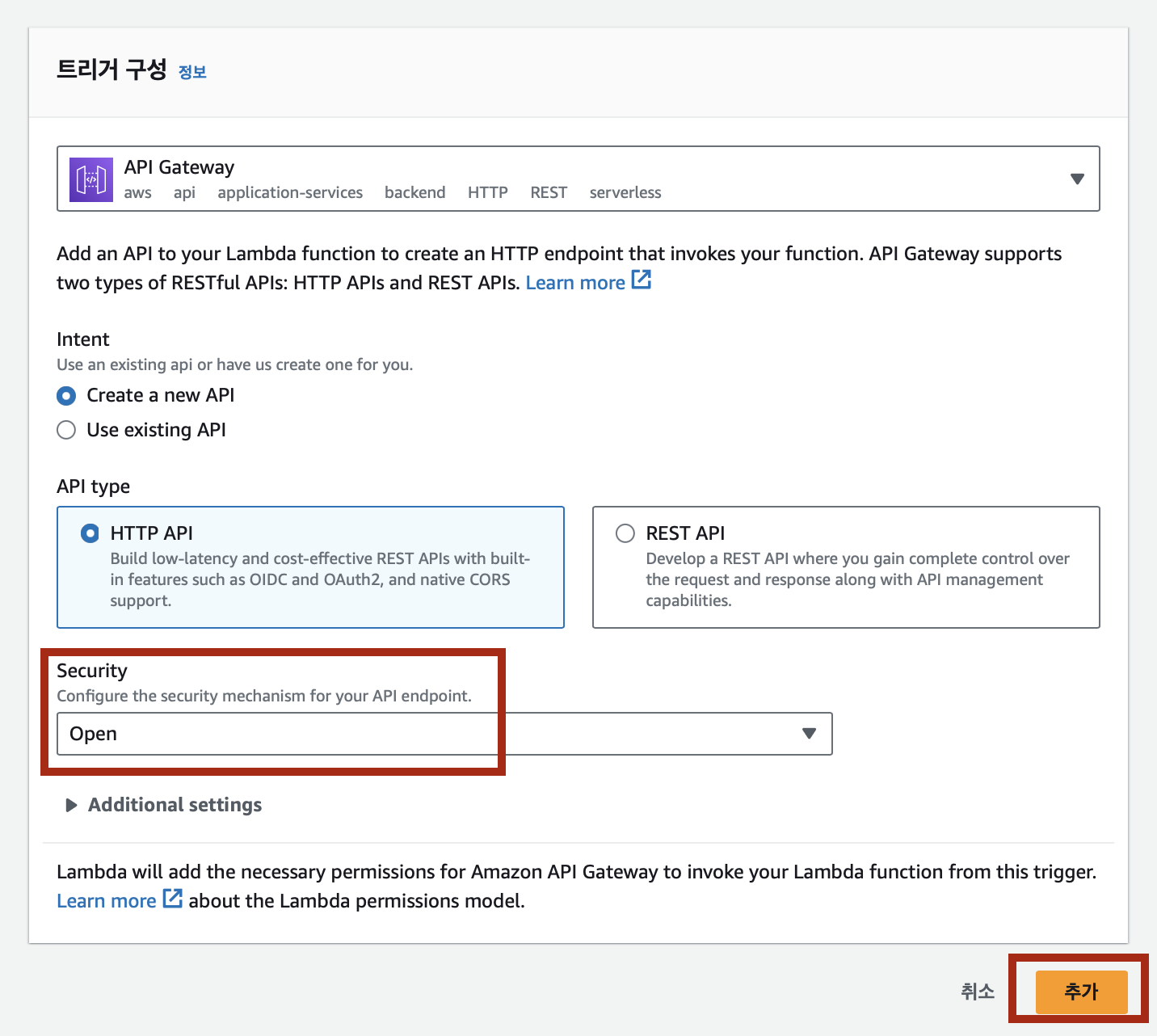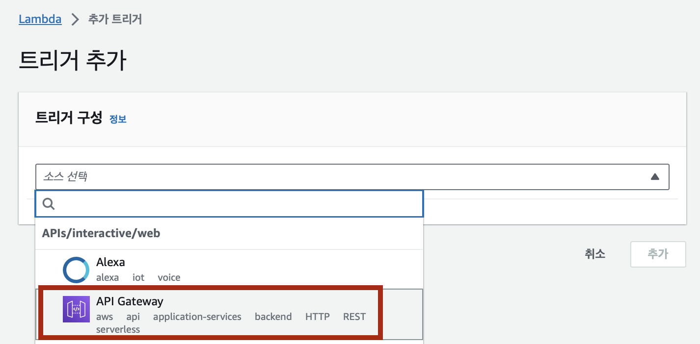 이제 람다 함수로 가서, 트리거를 추가해주겠습니다. 이벤트가 발생하면 잡아주는 친구입니다. 이번에 사용할 트리거는 API Gateway입니다.