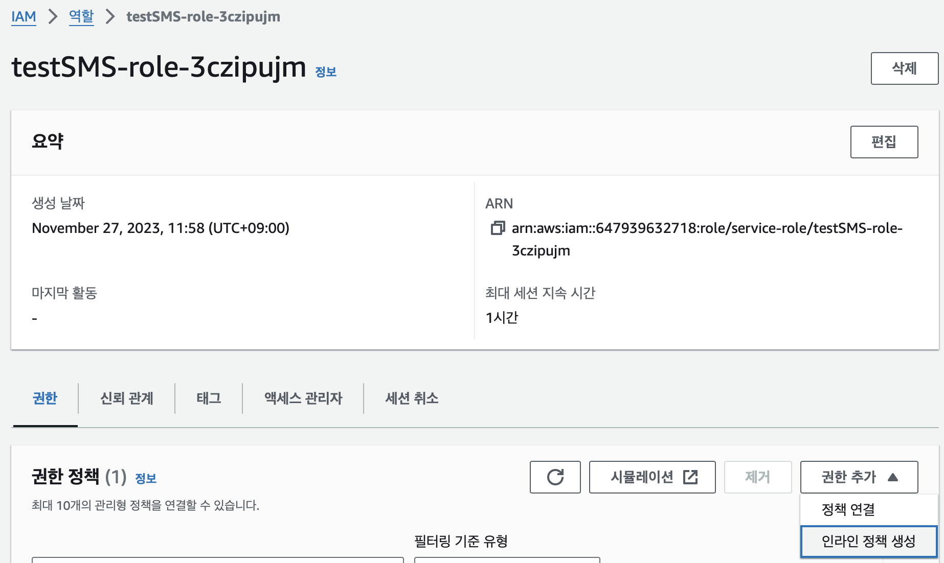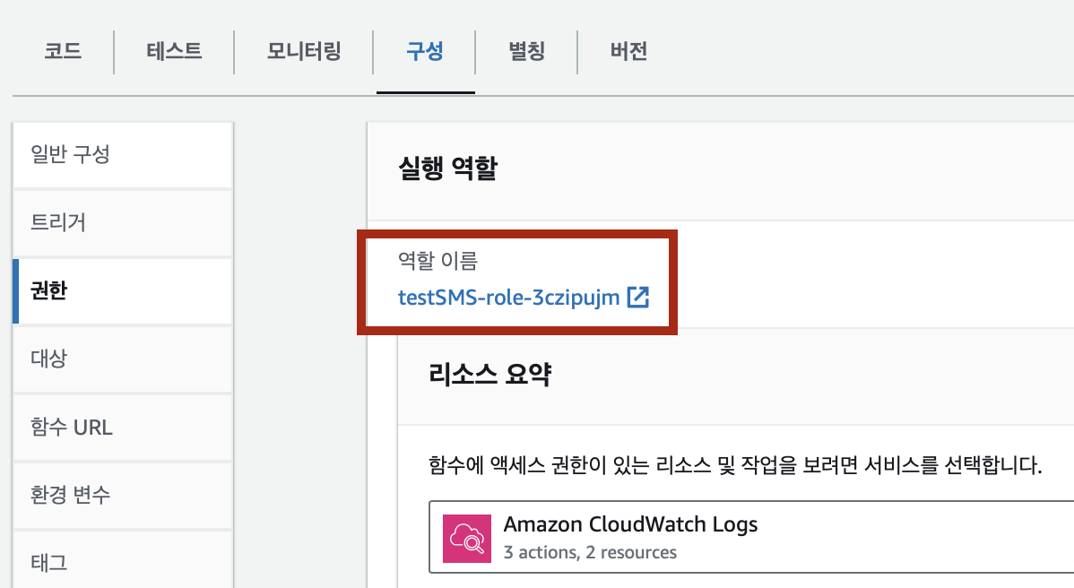 구성 > 권한으로 이동합니다. 실행 역할에 있는, 역할 이름 중 testSMS로 시작하는 것을 누릅니다.