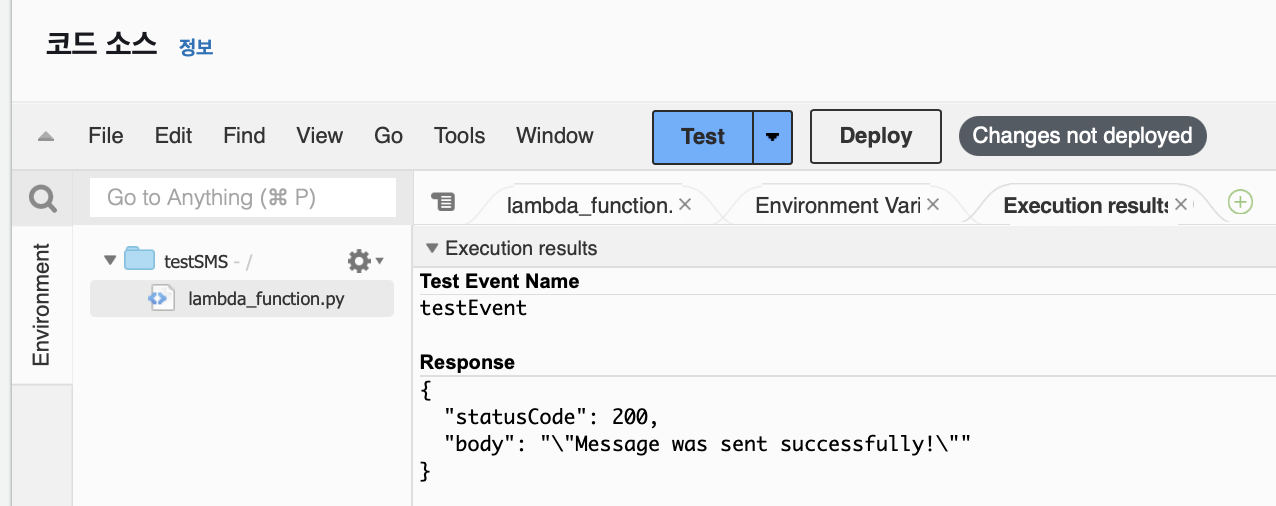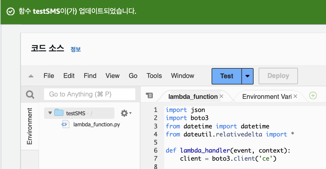 배포가 언제부터 저장하는 건지 모르겠지만, AWS는 그렇다고 하니 그렇게 합니다. 이렇게 함수가 업데이트되었다고 우측 사진처럼 나오면 일단 코드가 잘 저장된 것입니다.
