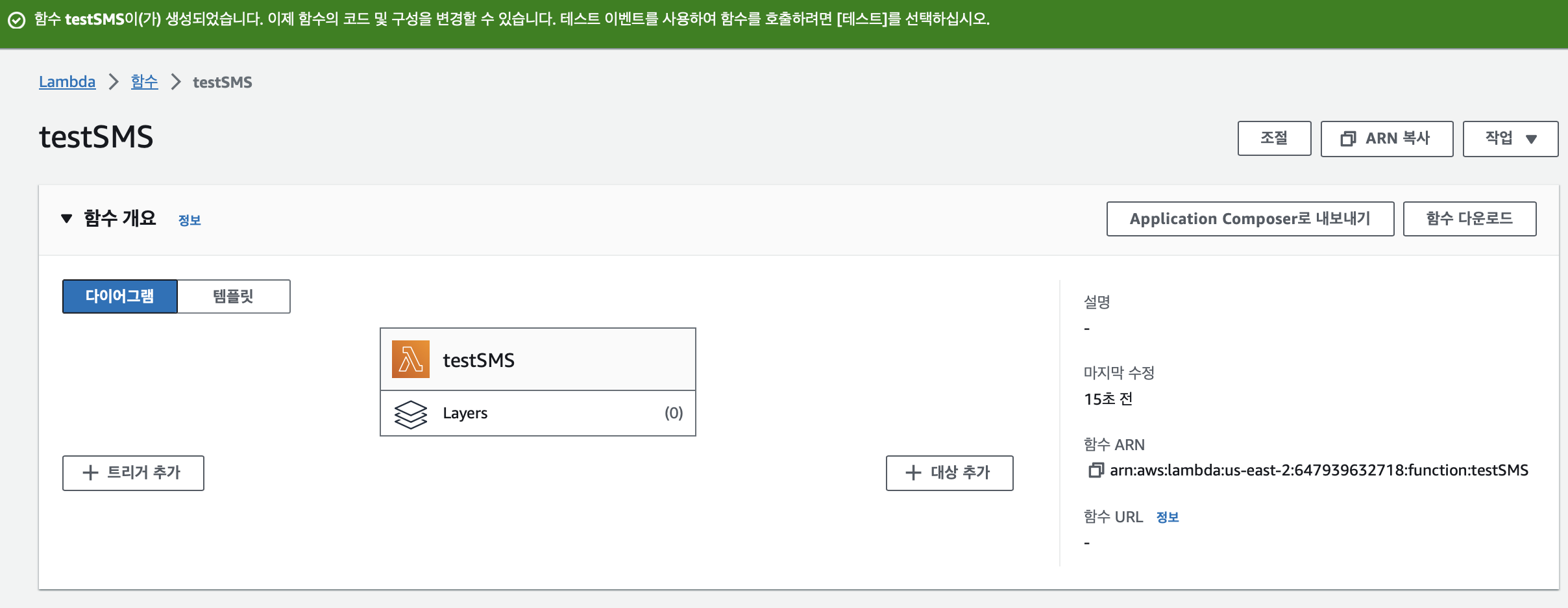 함수를 생성해보겠습니다. 이름은 testSMS로 할게요.