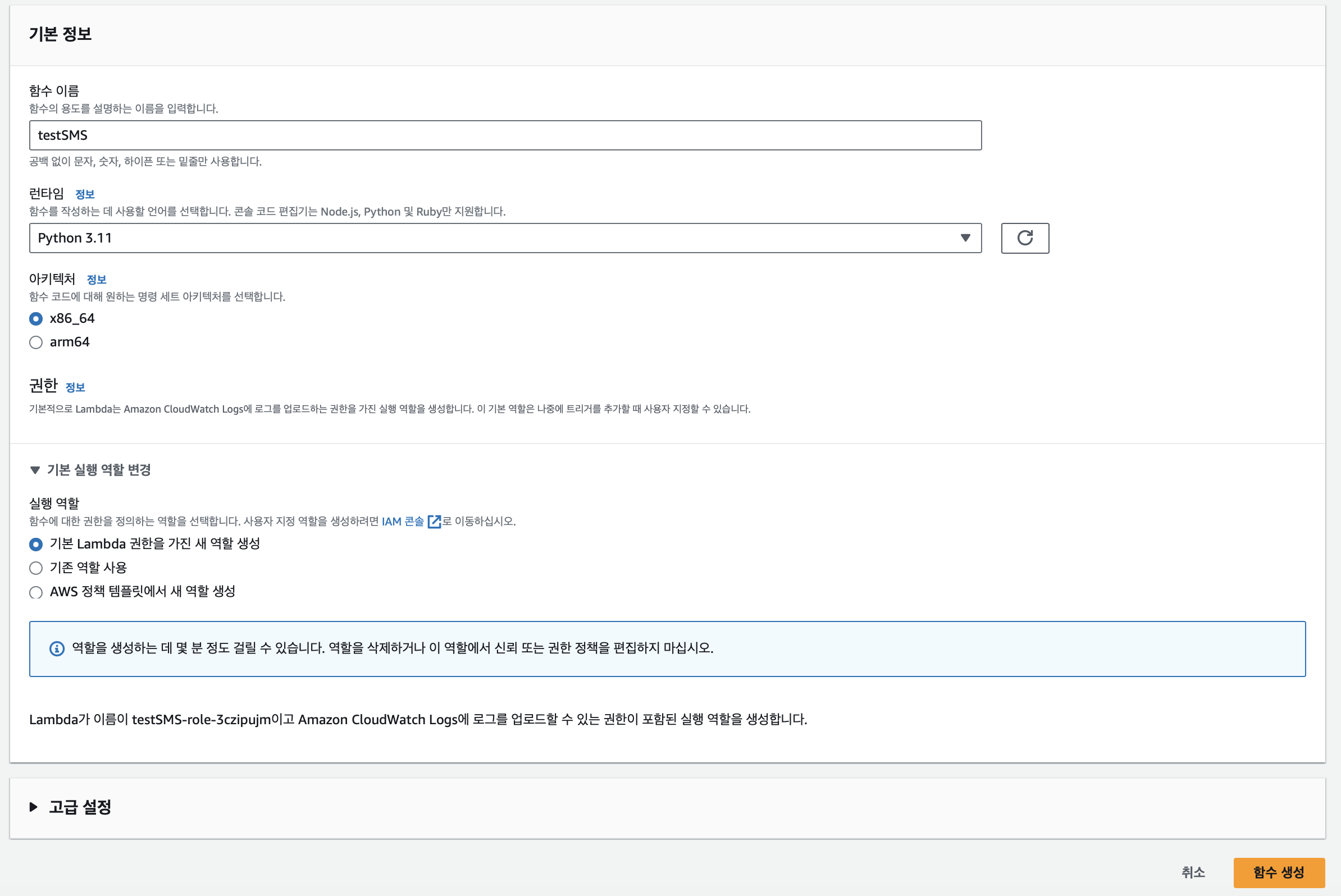 런타임 Python 3.11, 아키텍처 x86_64, 기본 실행 역할 변경은 기본 Lambda 권한을 가진 새 역할을 생성하도록 합니다.