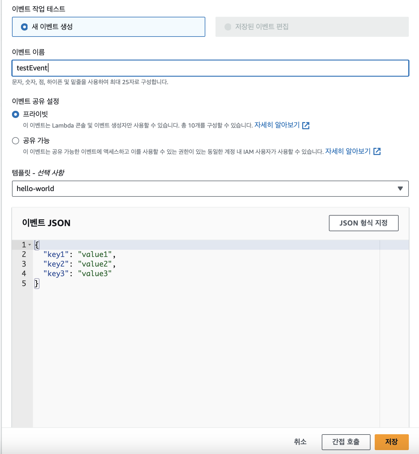 다음은, Test라는 버튼을 누르면 나오는 이벤트 설정 영역입니다. 테스트 이벤트는 람다 함수 호출을 위한 JSON 객체이며, 이것으로 함수의 호출 결과를 확인할 수 있습니다. 이벤트 이름은 testEvent로 하고, 저장을 누르겠습니다.