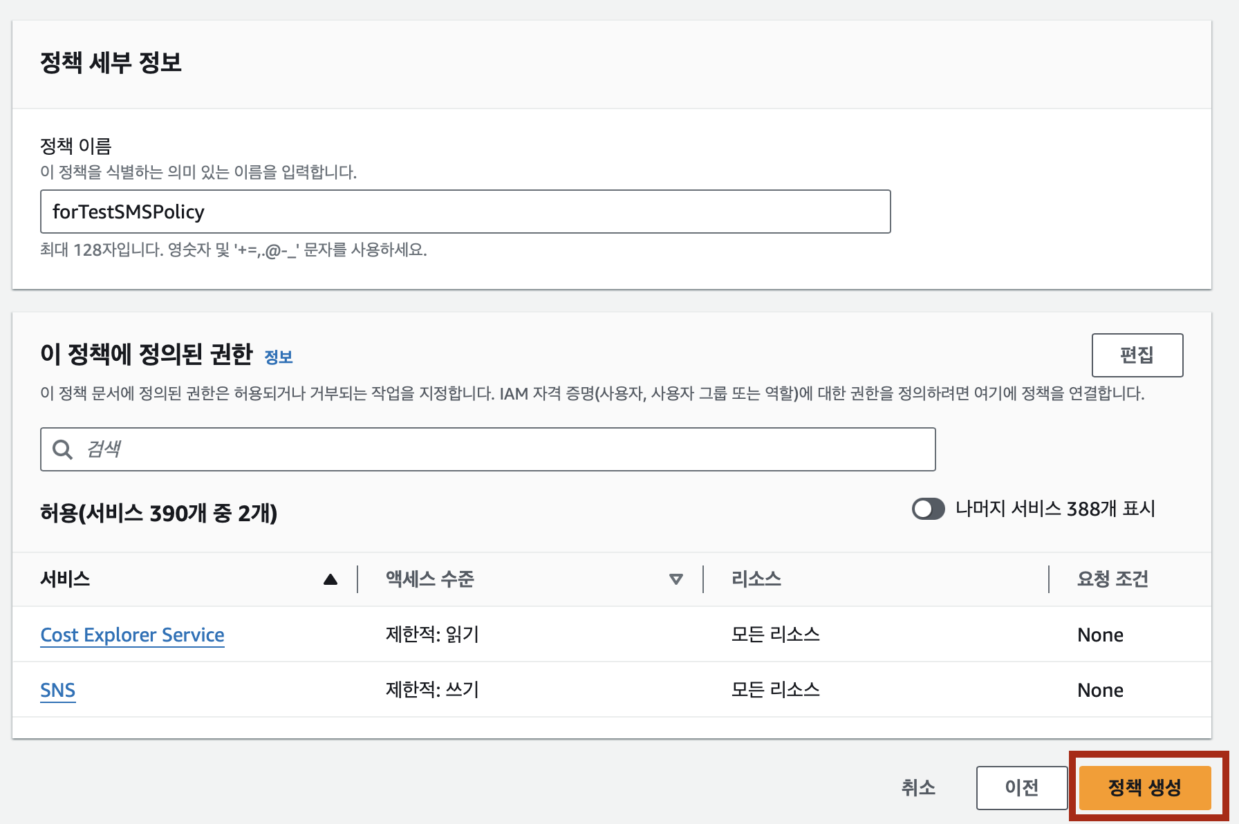 Cost Explorer Service에서 GetCostAndUsage를 추가하고, SNS Service에서는 Publish + All 리소스를 선택하여 추가합니다. 다음을 누르고, 이렇게 만든 정책을 forTestSMSPolicy 이라고 명명합니다. 정책 생성을 누릅니다.