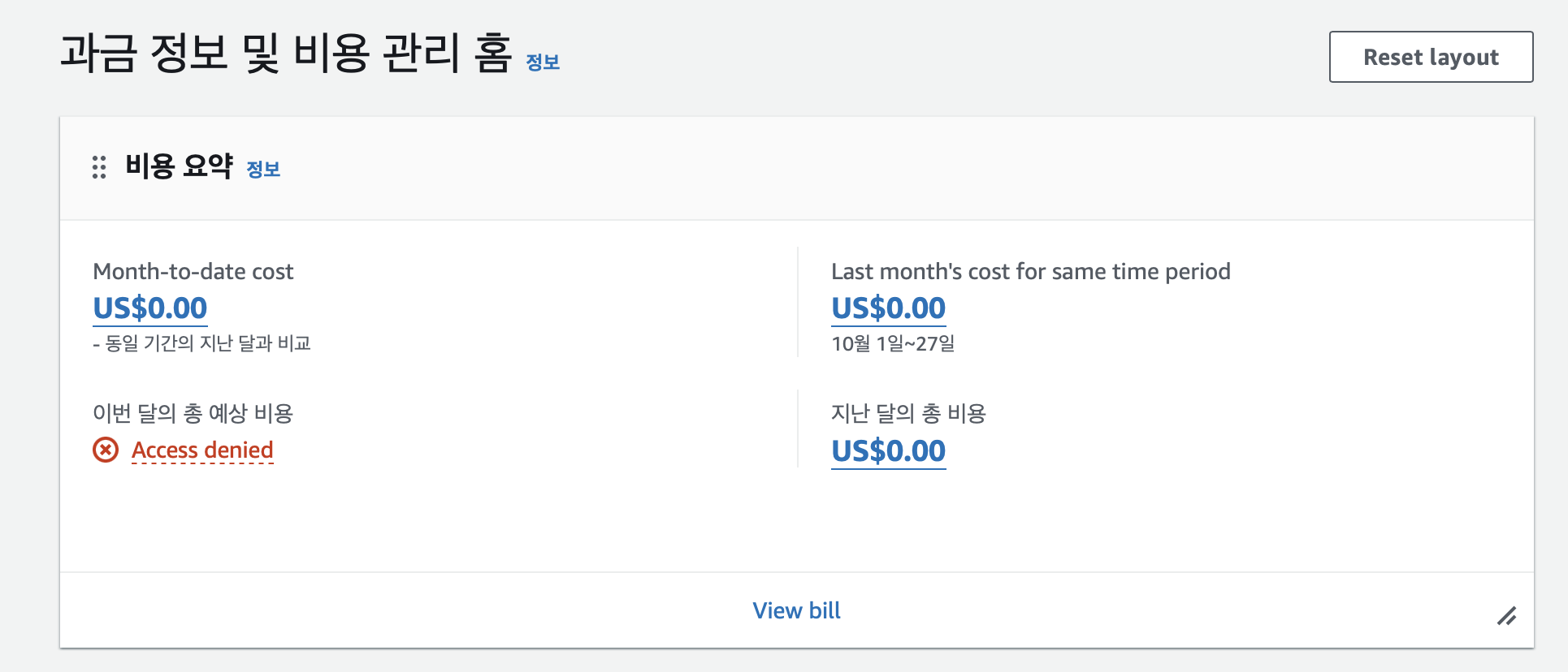 먼저, AWS에서 Cost를 검색해서 들어갑니다. 아래는 제 비용 관리 화면입니다.