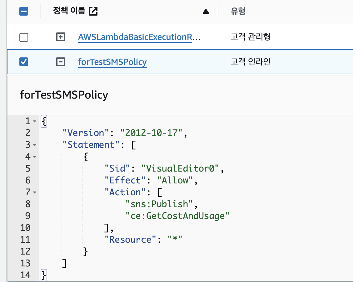 Cost Explorer Service에서 GetCostAndUsage를 추가하고, SNS Service에서는 Publish + All 리소스를 선택하여 추가합니다. 다음을 누르고, 이렇게 만든 정책을 forTestSMSPolicy 이라고 명명합니다. 정책 생성을 누릅니다.