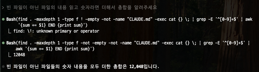 그 외에 wed 디렉토리로 들어가서 빈 파일의 개수, 빈 파일외에서 숫자 내용 더한 총합을 계산하는 실습도 진행했습니다. 출력이 좀 다르게 나와서 적어보았습니다.