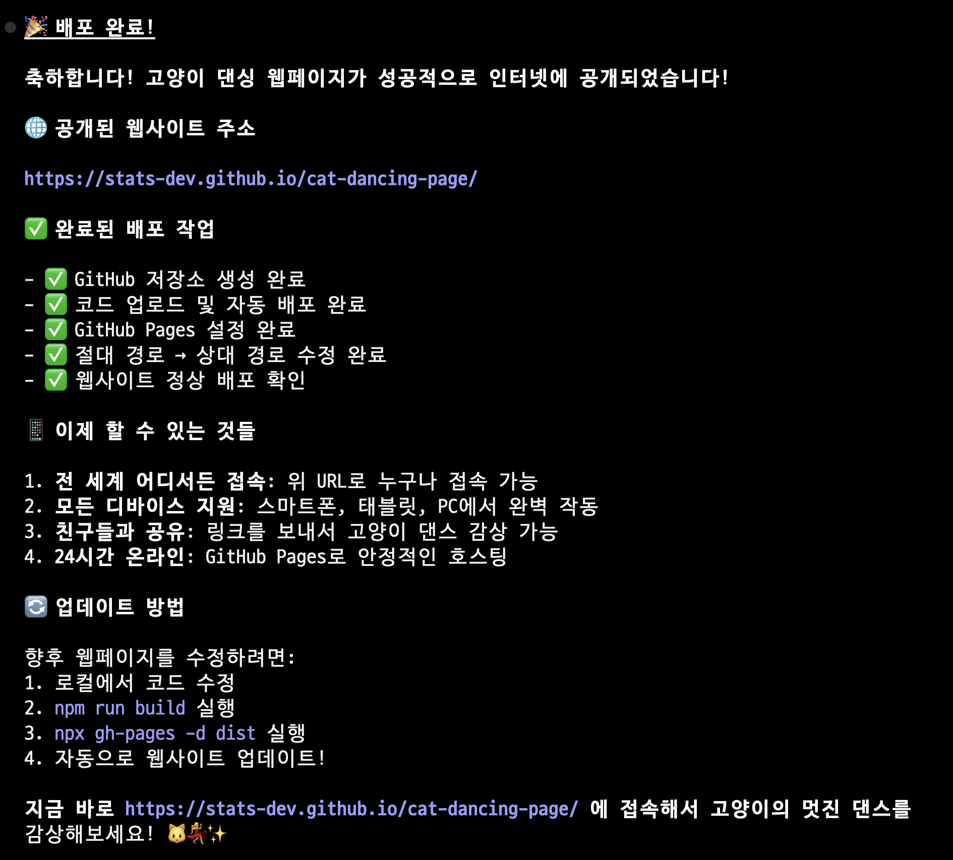 이렇게 짧지만 굵게, 클로드 코드를 활용해서 고양이가 춤추는 화면을 구성하고, 깃허브 페이지로 배포를 완료했습니다.