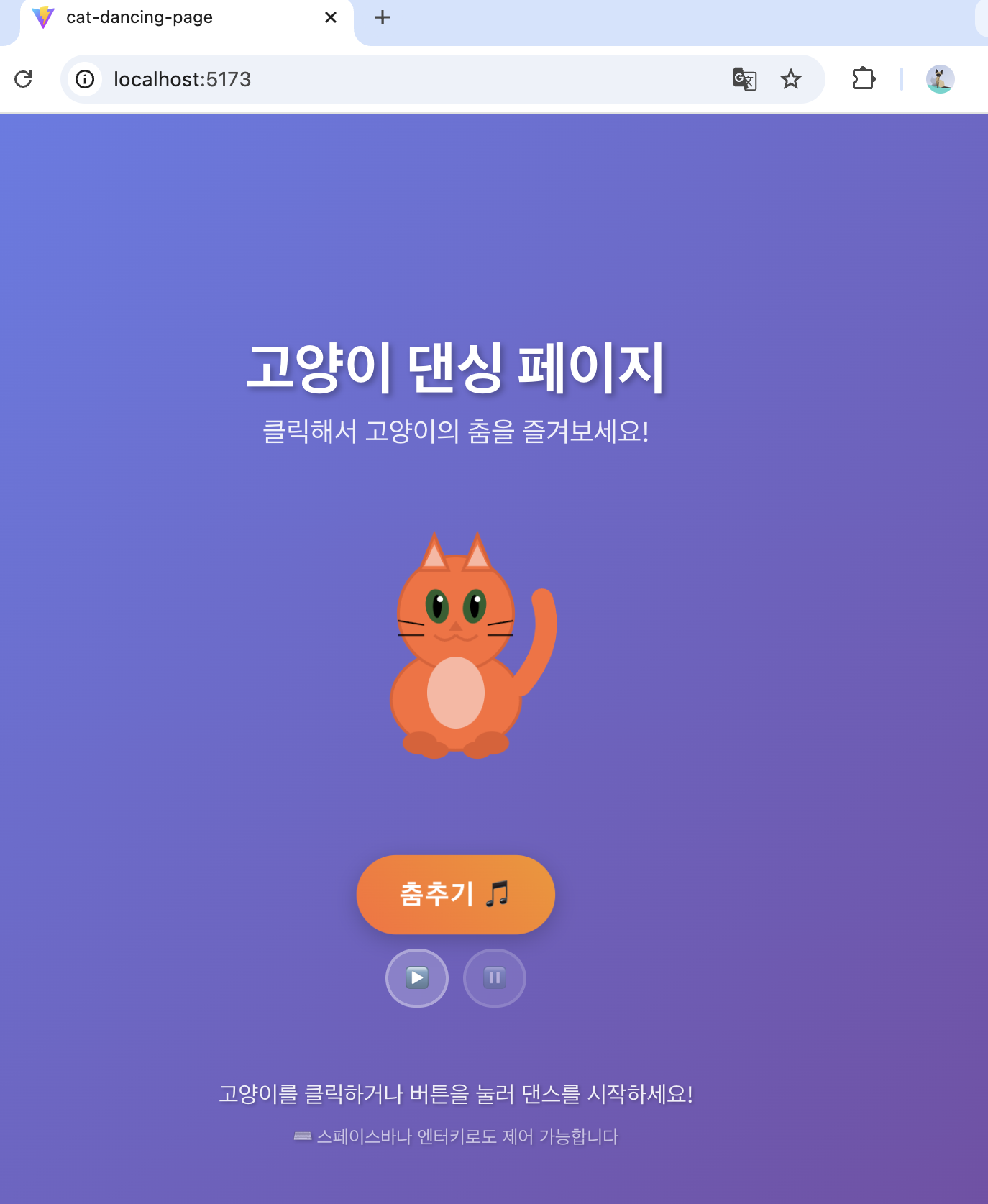 춤추는 고양이 화면이 잘 나타납니다. 춤추기 버튼을 누르면, 움직이는 고양이를 확인할 수 있고, 스페이스바나 엔터키로도 춤추기, 멈추기를 변경하며 작동이 가능합니다.
