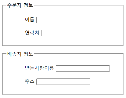 예를 들어보겠습니다. 아래는 주문자 정보와 배송지 정보를 fieldset으로 묶고, legend를 주었을 때 나타나는 그림입니다.