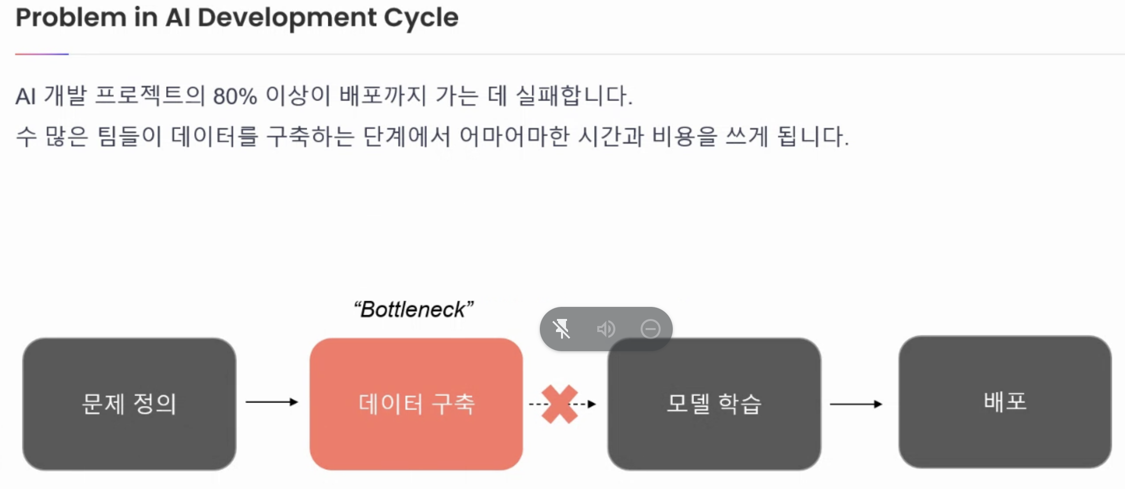 AI 개발에 80%이상이 배포에 실패하는데, 데이터 구축부터 엄청난 돈과 시간을 쓴다. 들인 돈과 시간에 비해 실제로 적용이 잘 안된다면 자꾸 멈추게 된다. 때문에 특정 모델을 사업에 적용할 수 있는지 확인하기가 어려운 문제가 발생한다.