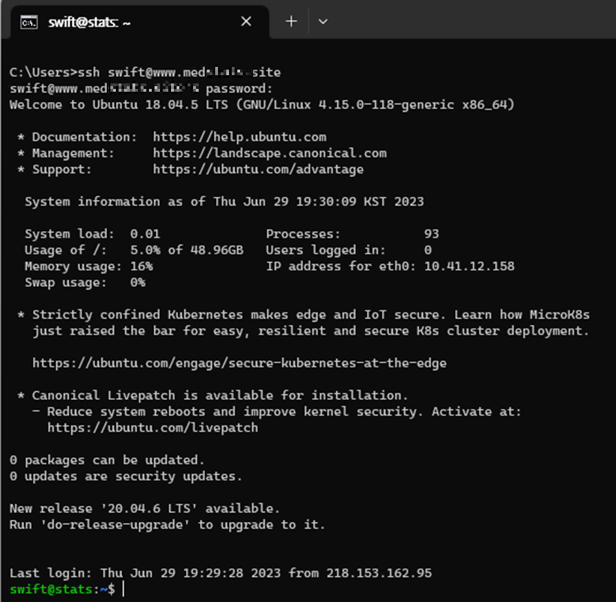 공인 아이피 주소는 네이버 클라우드에서 서버를 개설한 후 Public IP로 설정한 해당 주소를 입력합니다. root라는 루트 사용자(수퍼유저)와 swift라는 일반 사용자 아이디로 접속해보겠습니다. 포트번호를 언급해야한다면 뒤에 -p 22를 붙여서 입력합니다.