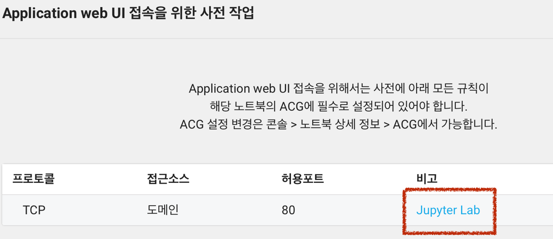 다음은 노트북 서버 컴포넌트에 사용자 설정하는 부분입니다. Jupyter Lab 컴포넌트의 Access Password는 접속시 사용할 비밀번호로 필수 입력값입니다. 비밀번호는 8자 이상, 20자 이하의 영문자, 숫자 및 특수문자를 조합해서 사용해야 합니다. ACG는 자동으로 생성되는데, 차후 활용을 위해 기억해두세요.